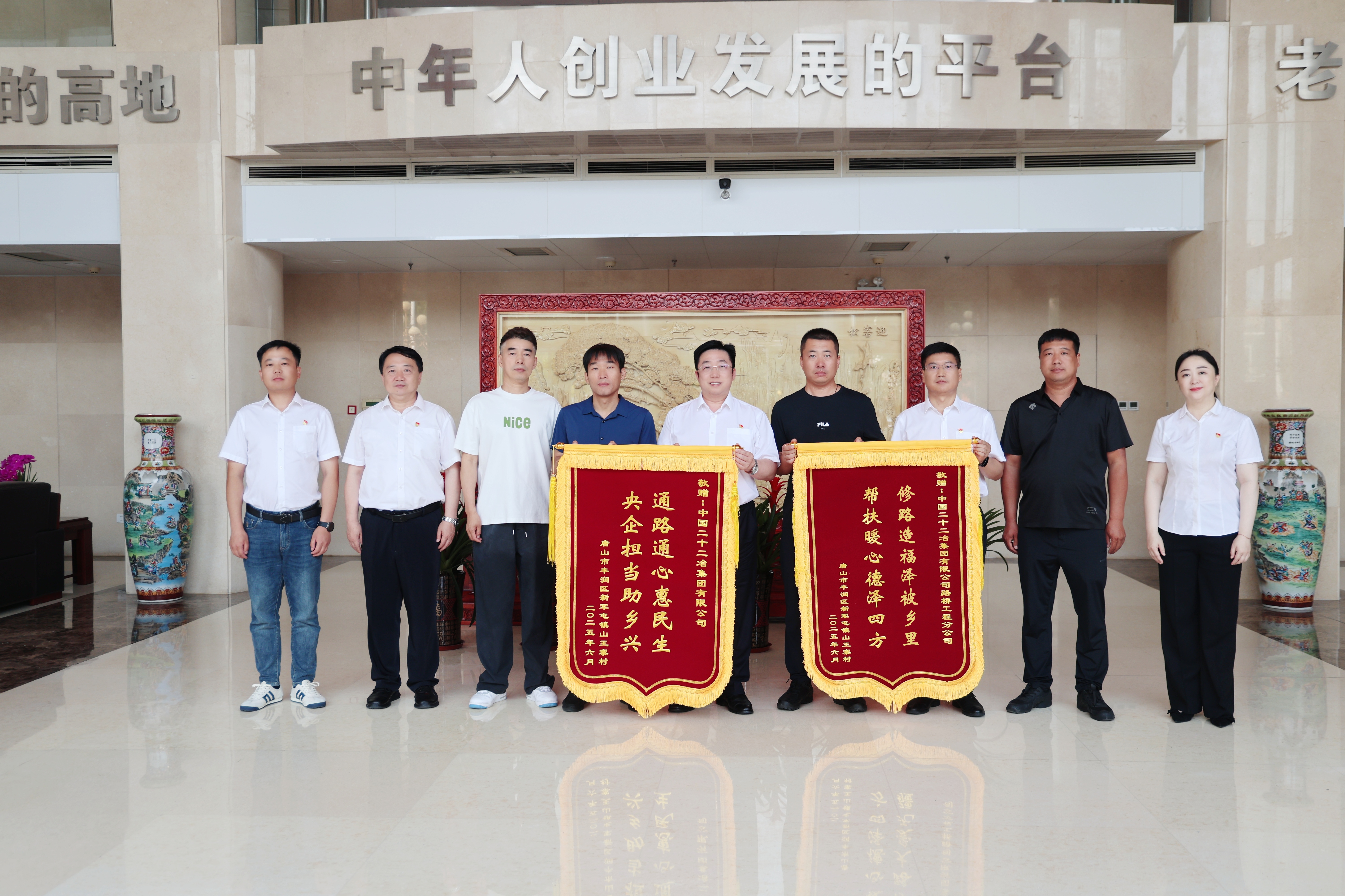 6月18日,唐山市總工會副主席付競楠一行來到中國二十二冶辦公大樓,將寫著“通路通心惠民生 央企擔當助鄉興”和“修路造福澤被鄉里 幫扶暖心德澤四方”的兩面錦旗送到了公司領導手中,表達對中國二十二冶路橋分公司傾力幫扶的深深謝意。
