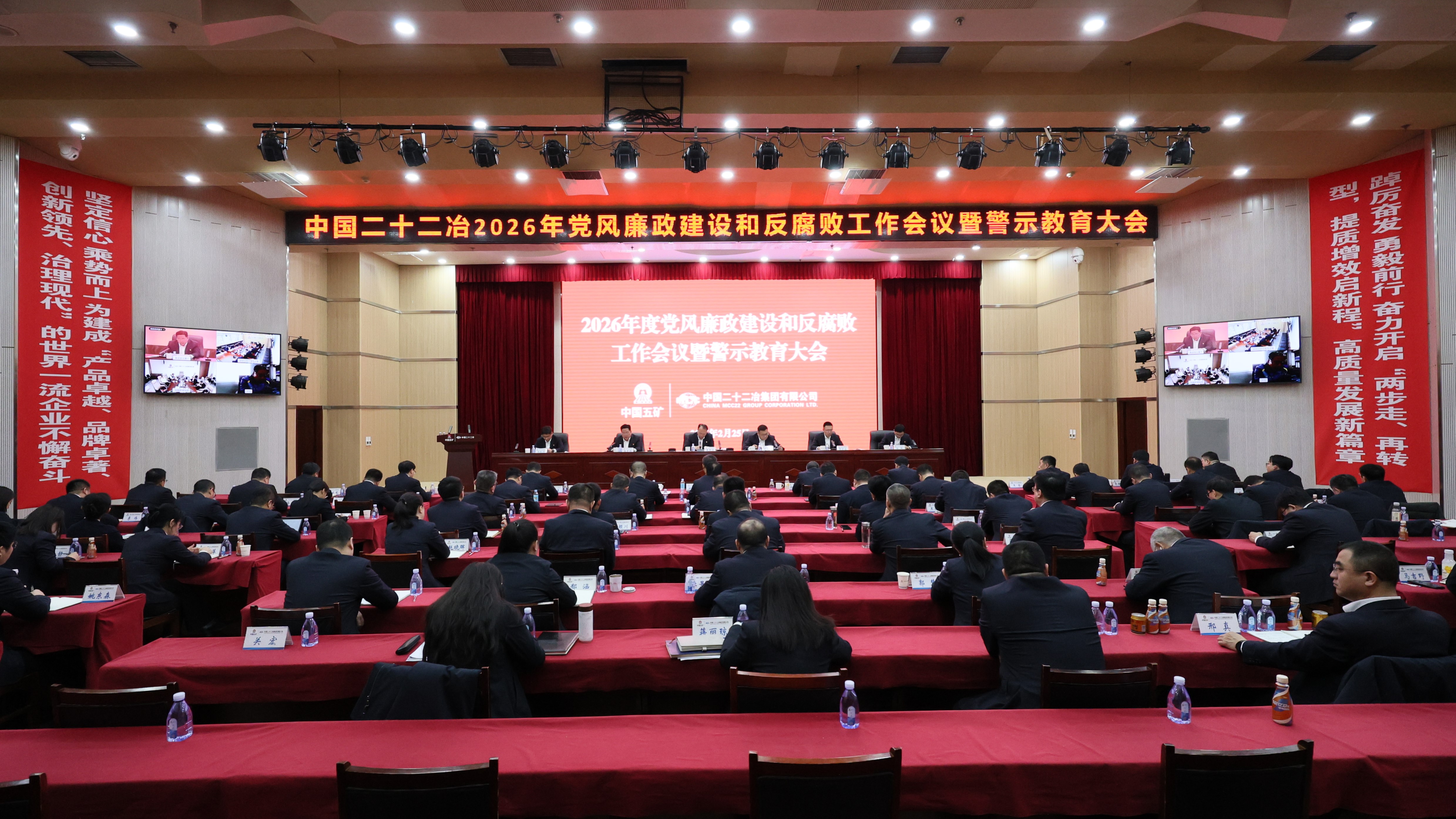 2月25日,中國二十二冶召開2026年度黨風廉政建設和反腐敗工作會議暨警示教育大會。中國二十二冶黨委書記、董事長袁斯浪出席會議并講話,黨委副書記、總經理慈國強主持會議,黨委副書記、職工董事張育鵬傳達中國五礦、中國中冶2026年黨風廉政建設和反腐敗工作會議精神,紀委書記田和平回顧總結2025年黨風廉政建設和反腐敗工作、部署2026年重點任務。