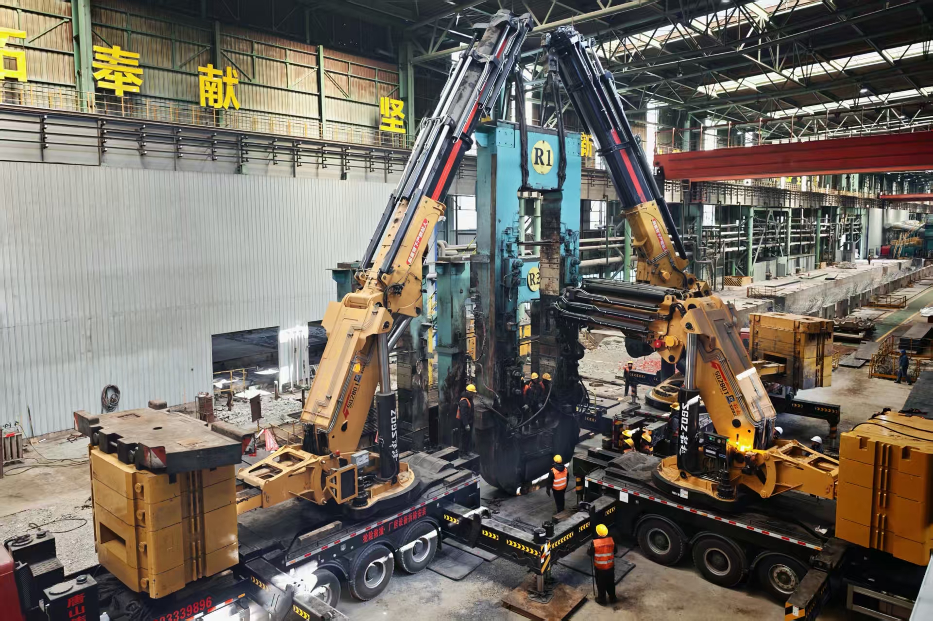 此次吊裝作業是ESP全豐線升級改造的核心環節,需在廠房內狹窄空間完成四塊157噸軋機牌坊的拆除吊裝。面對廠內最大天車僅100噸、遠不能滿足吊裝需求的嚴峻挑戰,公司高度重視,多次現場統籌協調;項目部迎難而上,創新采用三臺折臂吊協同吊裝方案,科學分配載荷、精準同步控制,成功破解場地受限與載荷不足的難題。施工過程中,項目管理人員全程堅守一線,各崗位協同配合、規范操作,確保了四塊牌坊全部一次吊裝安全就位。四塊單重157噸的軋機牌坊全部安全吊裝完成,標志著該生產線升級改造邁出關鍵一步。